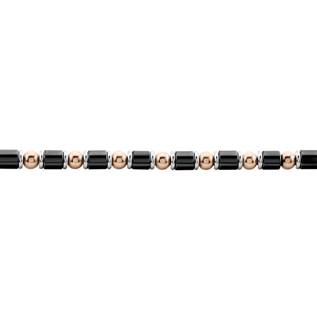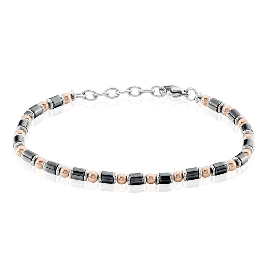 Bracelet Acier Blanc Et Rose Et Ceramique Noire Boules Fantaisies Alternees 21cm