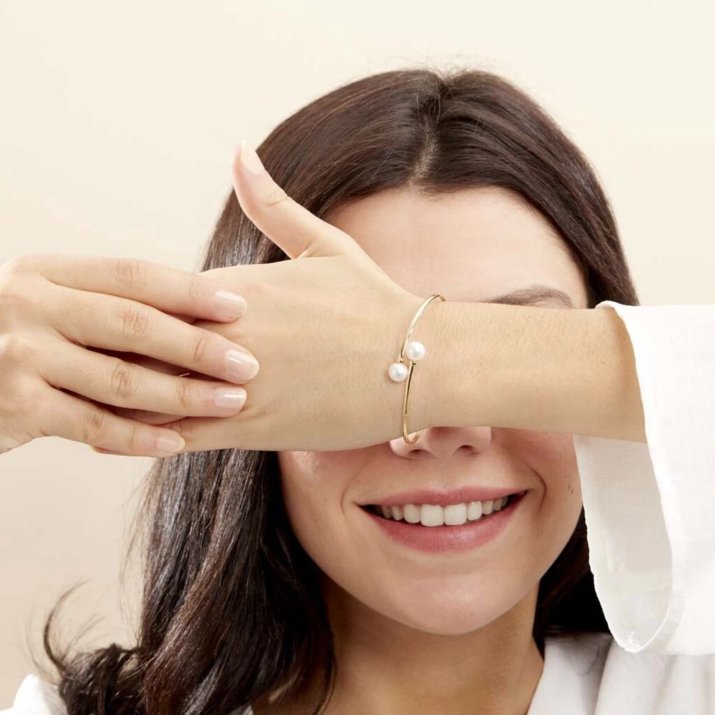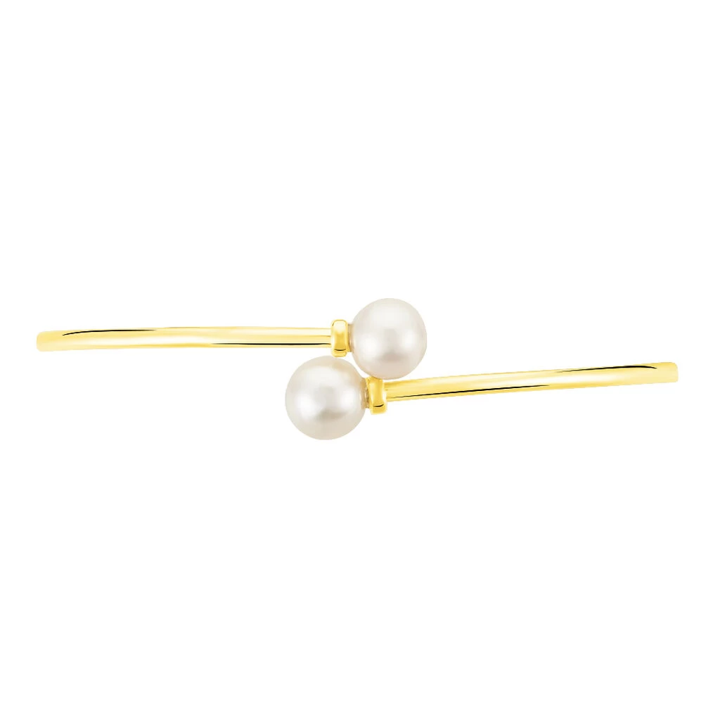 Bracelet Or Jaune 375/1000 Jonc Flexible Avec Double Perles De Culture Blanches