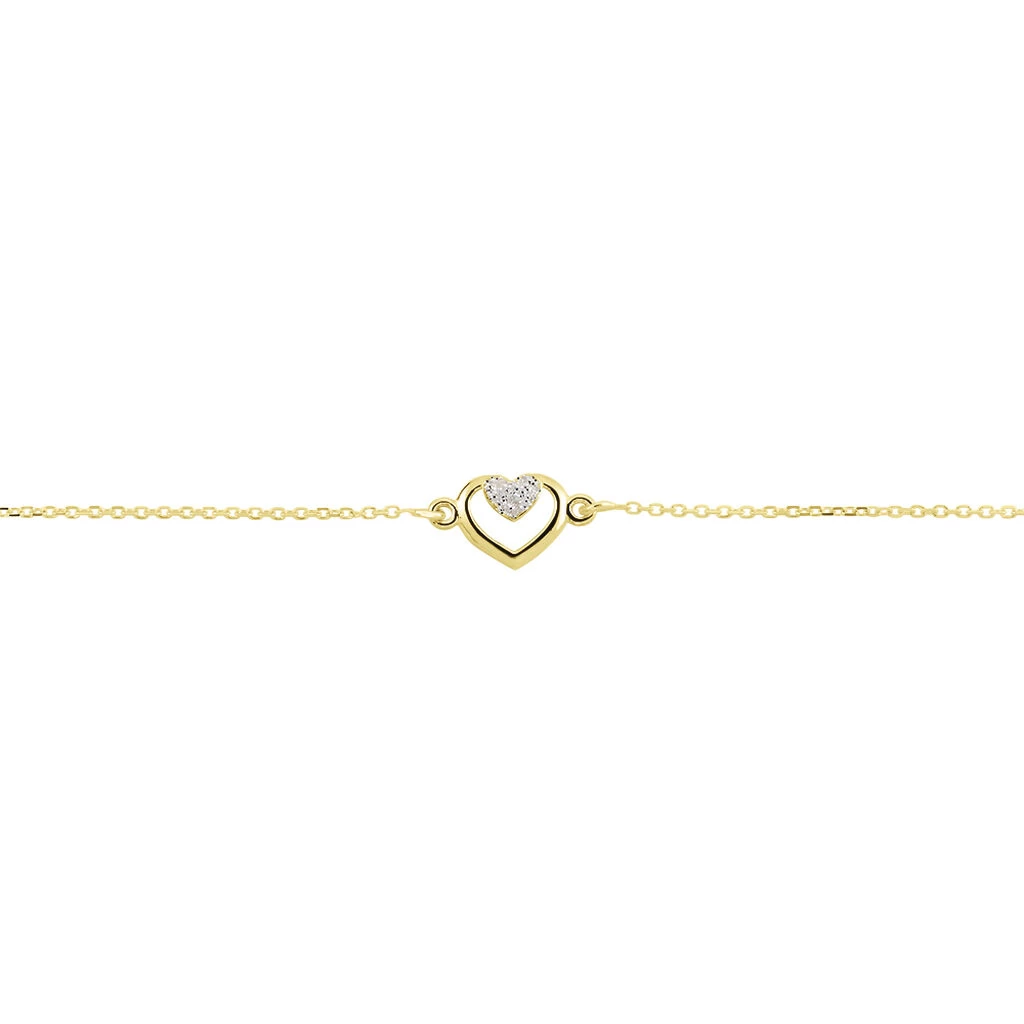 Bracelet Or Jaune 375/1000 Double Coeurs Avec Un Coeur Glitter Silver Maille Jaseron 16/18cm
