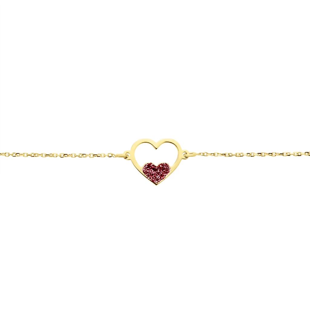 Bracelet Or Jaune 375/1000 Double Coeurs Glitter Rose Maille Jaseron 14/16cm