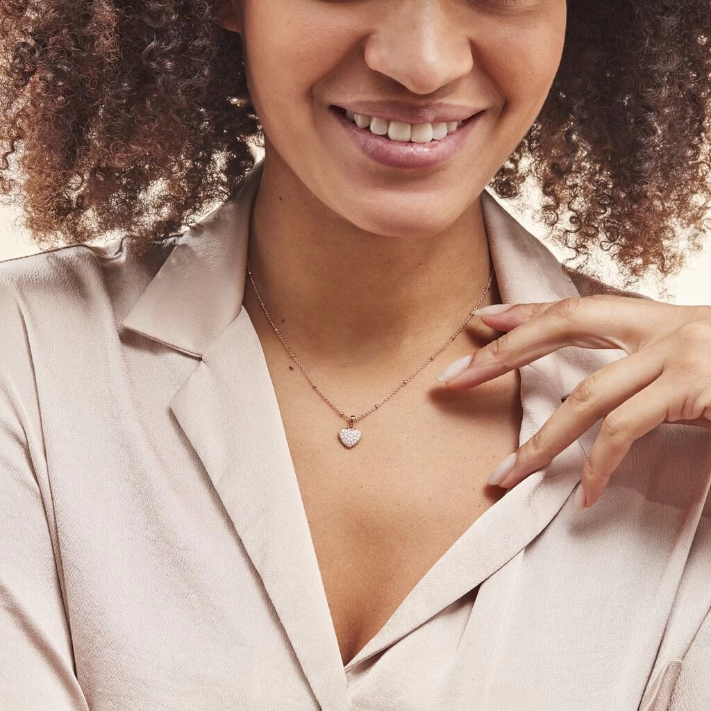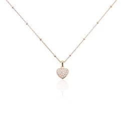 Collier Argent Rose 925/1000 Et Boules Cœur Pave Oxydes De Zirconium Maille Forcat 45cm